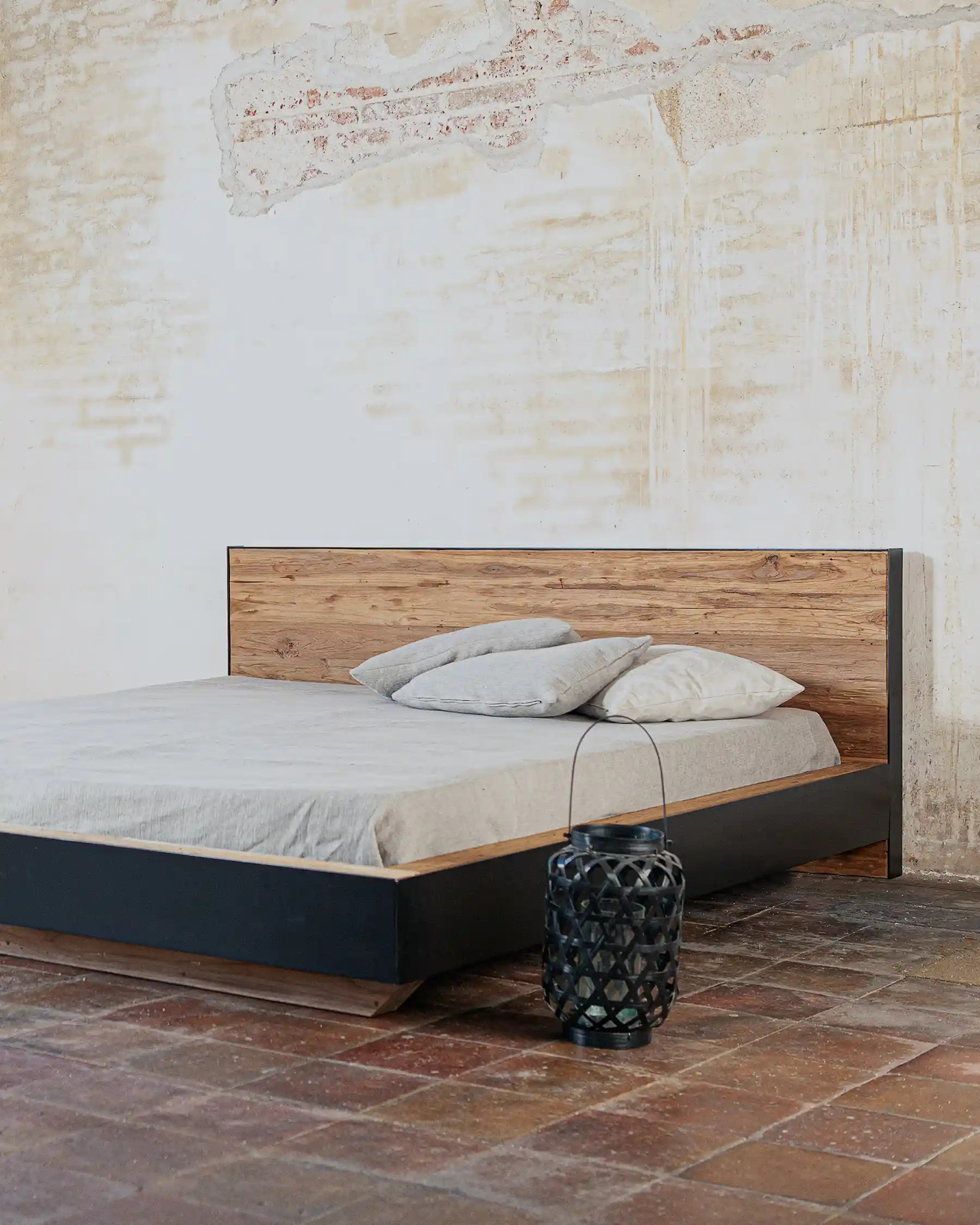 Le cadre de lit GEOX associe teck recyclé et fer noir dans un design industriel