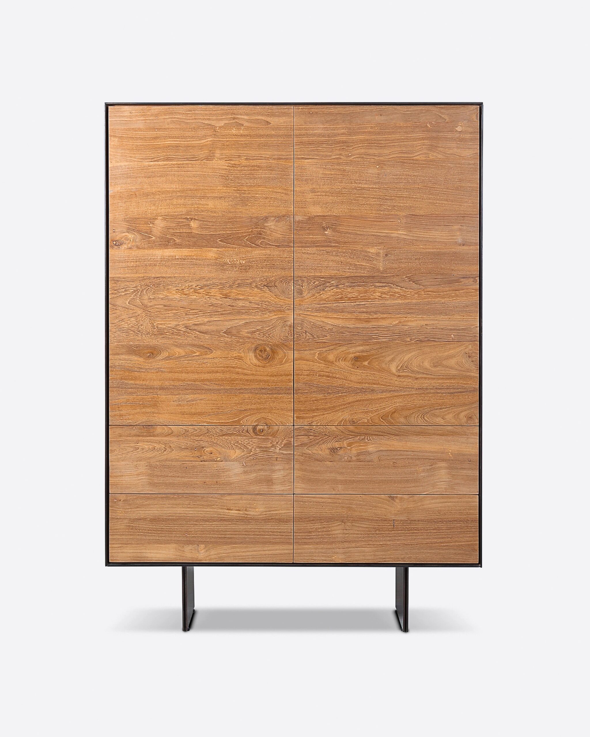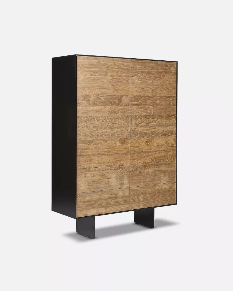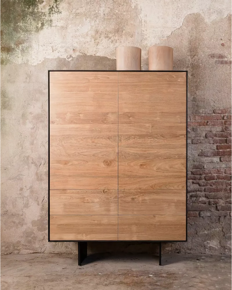 La vitrine GEOX 105 associe la chaleur du teck recyclé à la sobriété du fer noir,
